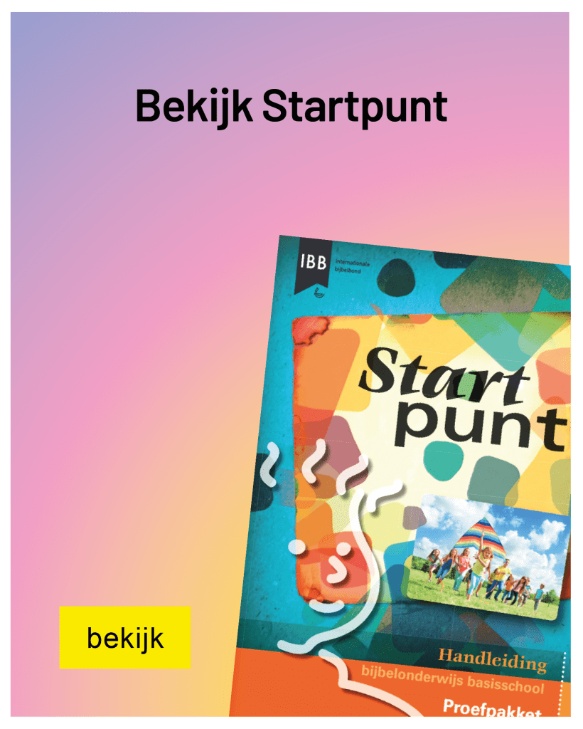 Startpunt helpt je als basisschoolleerkracht op inspirerende wijze invulling te geven aan het bijbelonderwijs. De methode bevat naast bijbelverhalen veel tips op het gebied van vertellen, aansluiten bij de actualiteit, verwerkingen en liederen. Het is een handleiding, die veel ruimte laat voor eigen creativiteit om de bijbelse geschiedenis in te vullen op een manier die past bij de klasse-situatie. In samenwerking met – vele – leerkrachten is Startpunt tot stand gekomen. Het materiaal bestaat uit twee jaaruitgaven voor de groepen 1/2, 3/4, 5/6 en 7/8. Iedere groep krijgt twee jaarmappen. In een cyclus van twee jaar kan de hele Bijbel doorgenomen worden.